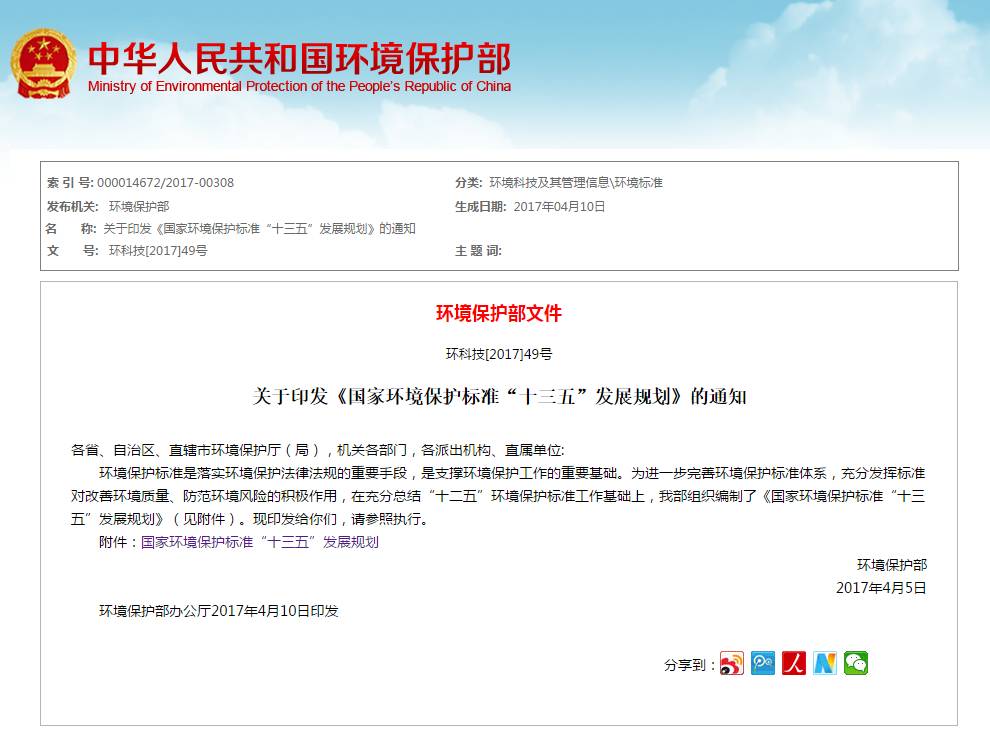 近日,环保部网站公开了《国家环境保护标准“十三五”发展规划》,《规划》指出,“十三五”期间,我国将启动约300项环保标准制修订项目,以及20项解决环境质量标准、污染物排放(控制)标准制修订工作中有关达标判定、排放量核算等关键和共性问题项目,发布约800项环保标准。
